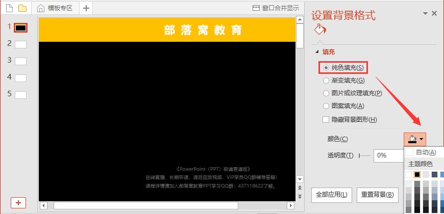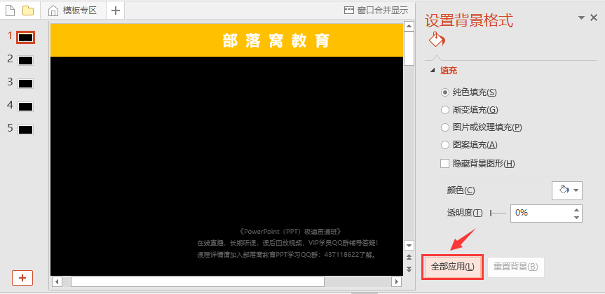 可以看到,只更改了当前页面背景,如果要将整个PPT的所有页面背景都更改为黑色,怎么办?很简单,一步就能实现。