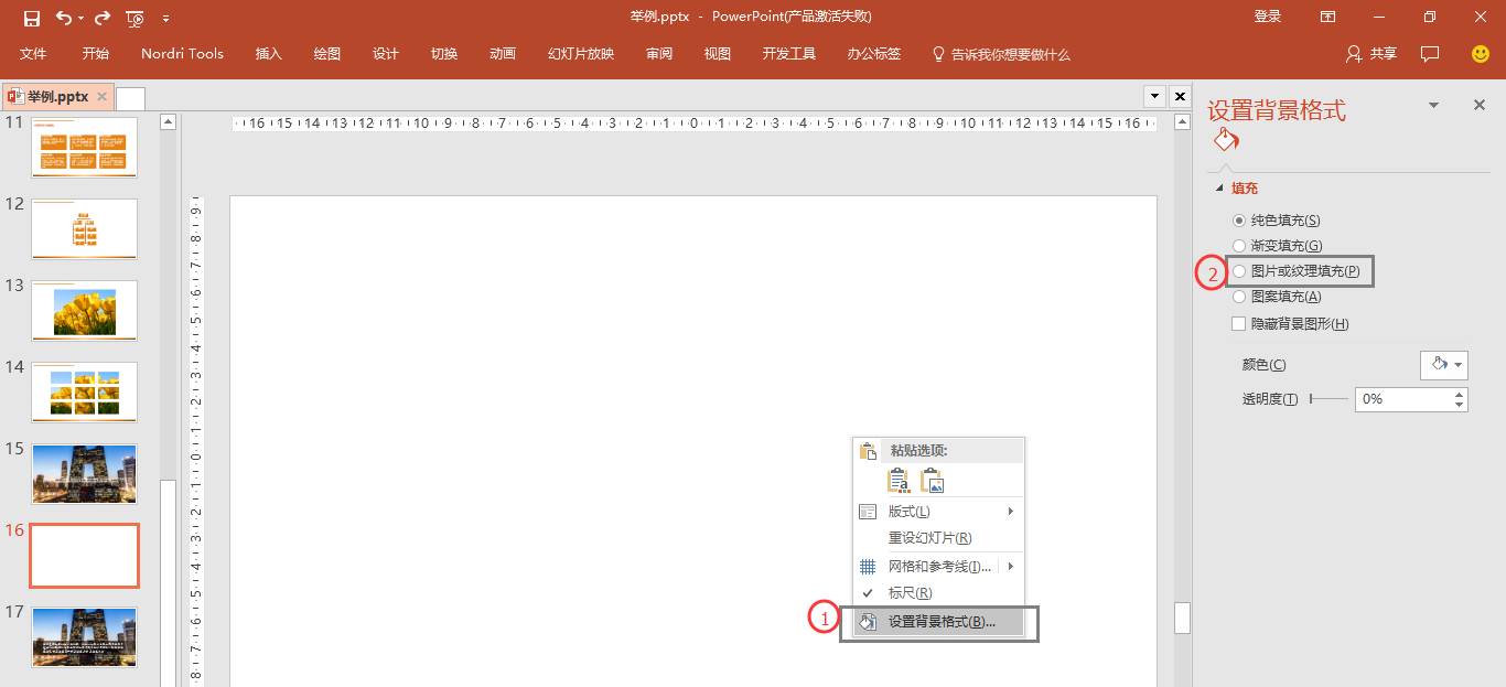 Step1:在空白页,鼠标右键单击,【设置背景格式】-【填充】图片或者纹理填充-从文件选择背景图。
