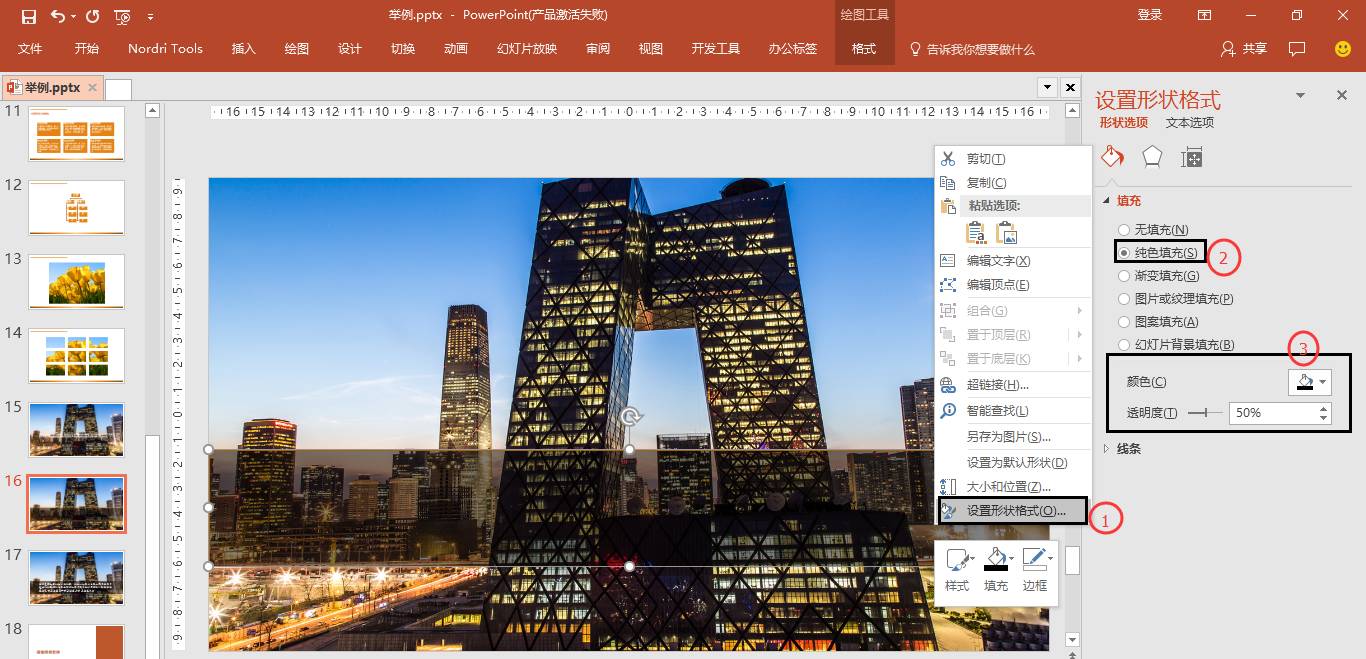 Step3:选中矩形,右键-设置单元格格式为纯色填充,颜色为黑色,透明度为50%,无轮廓。