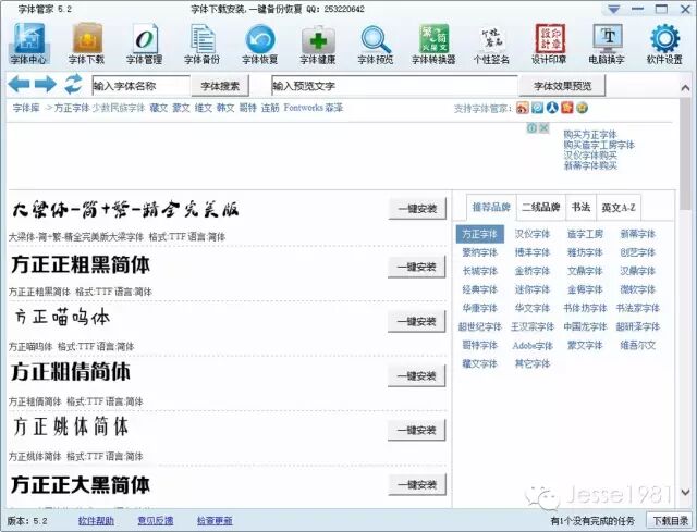 如果嫌麻烦,也可以使用专门的字体下载管理工具。这里推荐大家一款软件——字体管家使用字体管家,搜索、浏览、下载、安装可以一气呵成一键搞定,可谓省时省力。不过如果你要下载的字体在字体管家里搜不到(比如思源黑体),那就还是去站点下吧。