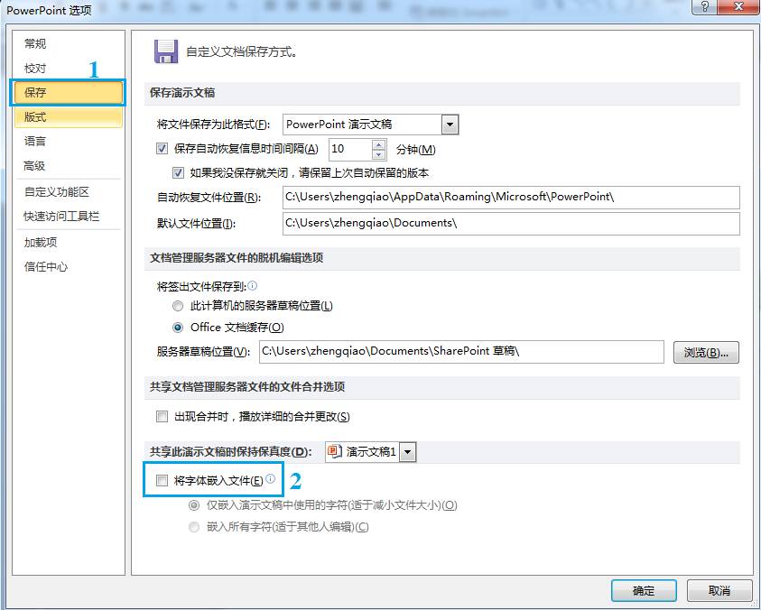 二、在弹出的选项框中选择“保存”——勾选“将字体嵌入文件”