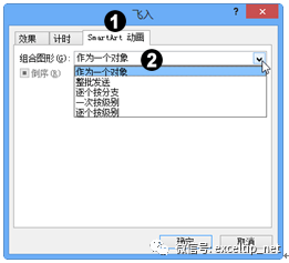 当为SmartArt图示设置动画时,也有一些专门的选项。单击功能区中的“动画”→“动画”→“动画窗格”按钮打开动画窗格,右击要设置的动画,在弹出菜单中选择“效果选项”或“计时”命令,在打开的对话框中切换到“SmartArt动画”选项卡,在“组合图形”下拉列表中设置SmartArt图示中每个形状在播放动画时的出现方式,如图7-26所示。