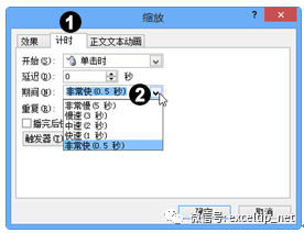 方法2        单击功能区中的“动画”→“动画”→“动画窗格”按钮打开动画窗格,右击要设置的动画,在弹出菜单中选择“计时”命令,打开如图7-22所示的对话框,在“期间”下拉列表中选择动画的播放速度。