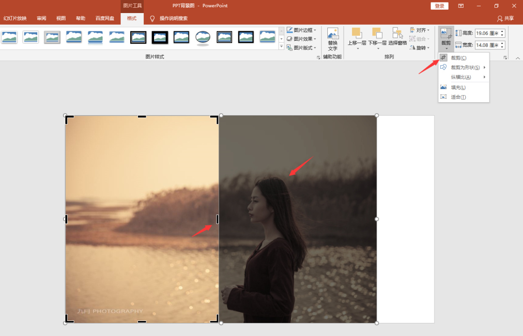 メ点击其中一张图片——格式——裁剪,裁剪边框拖动,将包含人物的半边图形裁减掉。メ