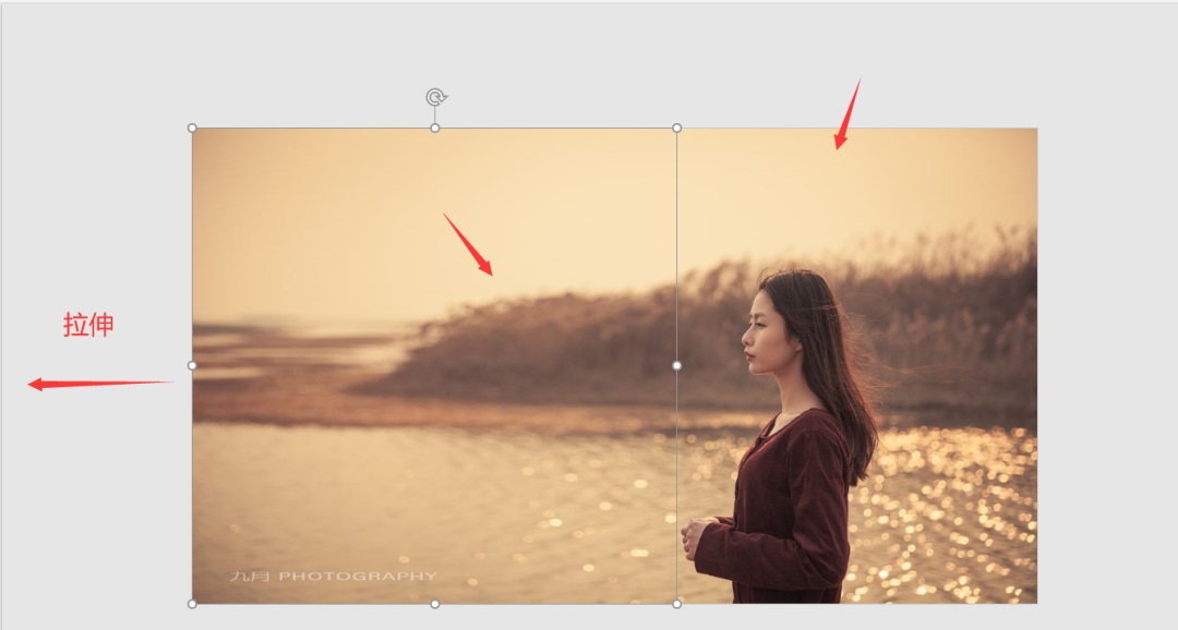 メ我们强行向右拉伸,人物就会变形(宽大),非常难看。メ