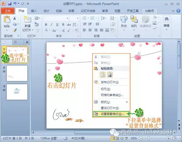PPT背景图片怎么设置。方式一:将需要的图片下载到电脑(ppt背景图片大全),然后在指定PPT幻灯片上右击一下,下拉菜单中选择“设置背景格式”。