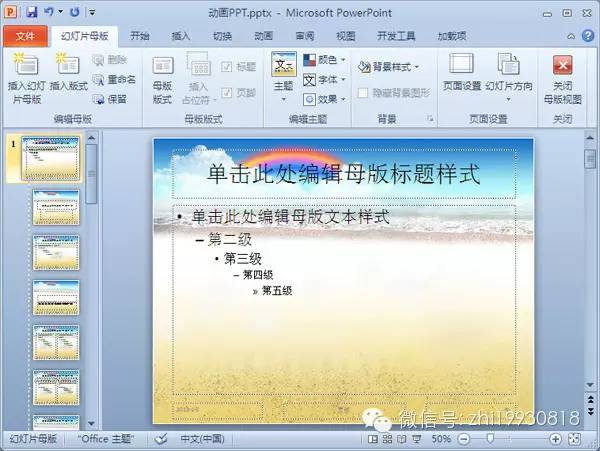 下图,看俺添加背景图片后效果。幻灯片母版的目的是使您进行全局更改(如还可以替换字形、添加动画等),并使该更改应用到演示文稿中的所有幻灯片。