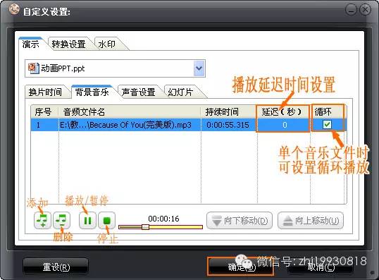 “自定义”设置。有演示、转换设置、添加水印选项。用得多的如“背景音乐”,支持添加多个音乐,人性化的“延迟”设置,和单曲的“循环”设置。