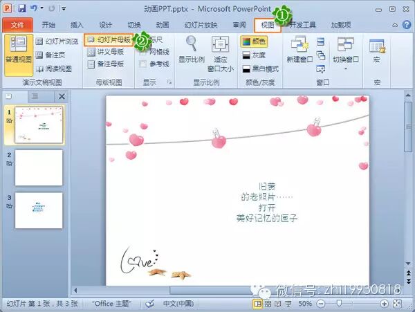 方式三:选择“视图”选项卡中的“母版视图”-“幻灯片母版”。注:母版设置好背景图片,返回到普通视图后,每张新建幻灯片上都会显示有母版所设置的背景图片。