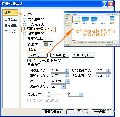 随后出现下图所示的对话框。选择“填充”-“图片或纹理填充”(当然你也可以选纯色、渐变、图案填充项),再选择“插入自:文件...”将本地电脑上的图片导入进来。然后还有背景图片的平铺选项,透明度。