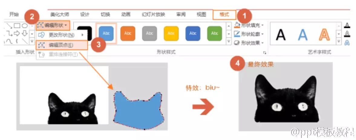 2、选中这个形状,在上方的窗口中选择“格式”,再选择“编辑形状”,再选择“编辑顶点”。