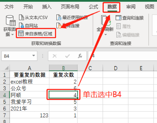 大家用鼠标点击A1:B7区域中的任意一个单元格(或者选中A1:B7区域亦可),如B4,然后,依次点击“数据”-“来自表格/区域”,如下图所示。
