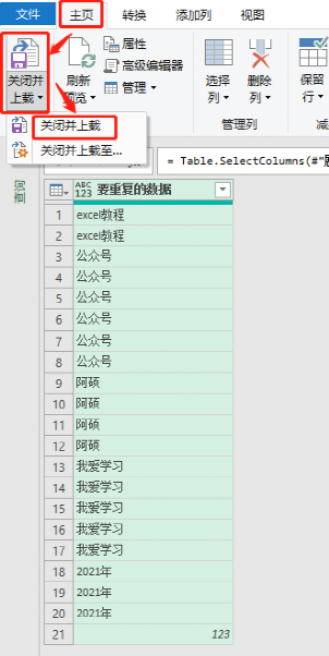 最后,只要将数据上载至Excel中就可以了。鼠标点击 “主页”-“关闭并上载”-“关闭并上载”即可。