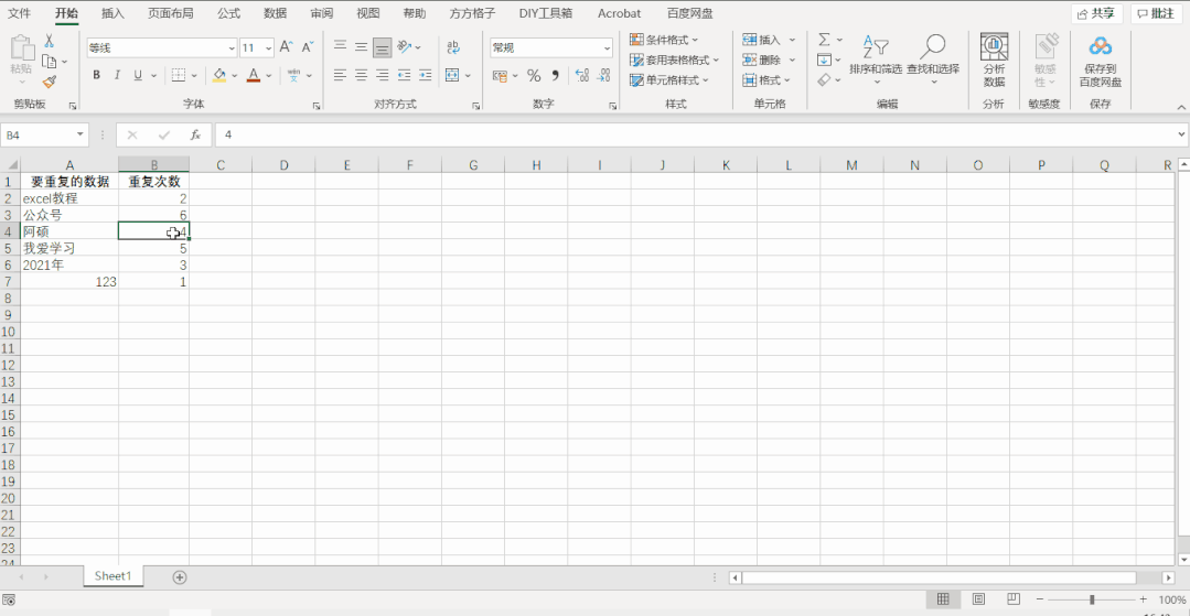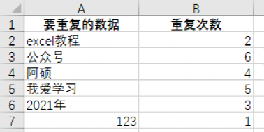 数据如下图所示,A列是要重复的文字内容,B列是对应的文字的重复次数。