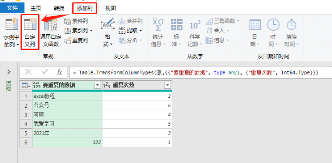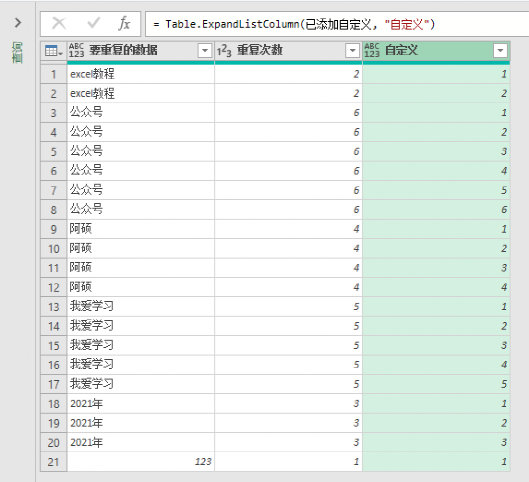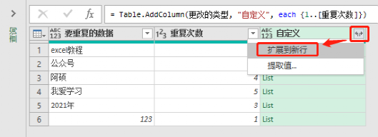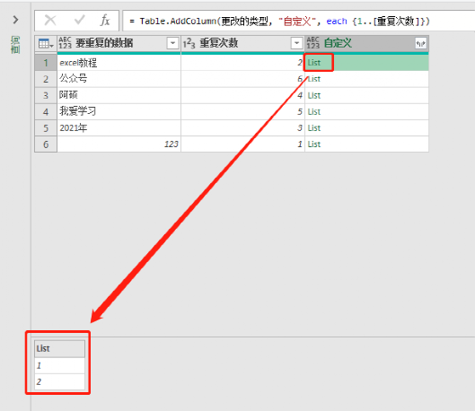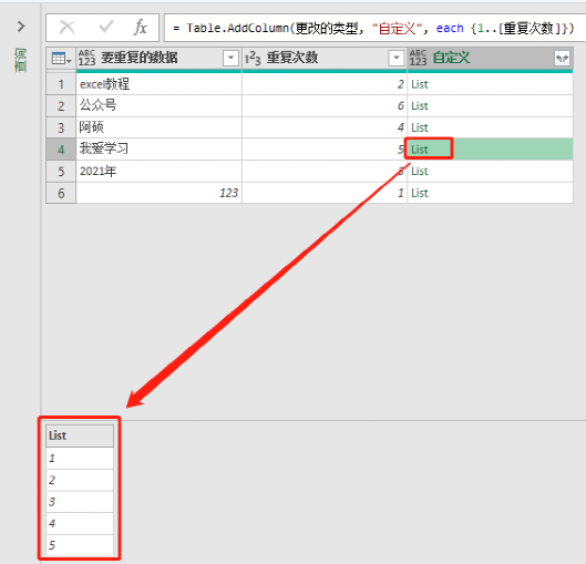 ② “添加列”和上面所写的代码结合在一起,意思就是增加一个自定义的列,这个列里的数据为从1到“重复次数”之间的所有数据(整数)。简言之,就是“重复次数”为几, List中的内容就是从1到几。