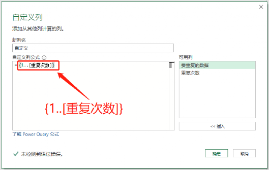 在弹出的“自定义列”对话框中,“新列名”字段中的“自定义”不变,在“自定义列公式”下方的等号(=)后面输入“{1..[重复次数]}”。