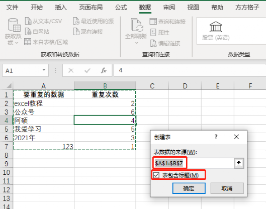 这时,在弹出的“创建表”对话框中,可以看到“表数据的来源”已经被Excel自动判断为“$A$1:$B$7”,“表包含标题”被默认勾选。