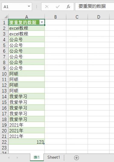 这时,Excel中自动生成了一个名叫“表1”的Sheet,表1中保存的就是将数据重复之后的结果。