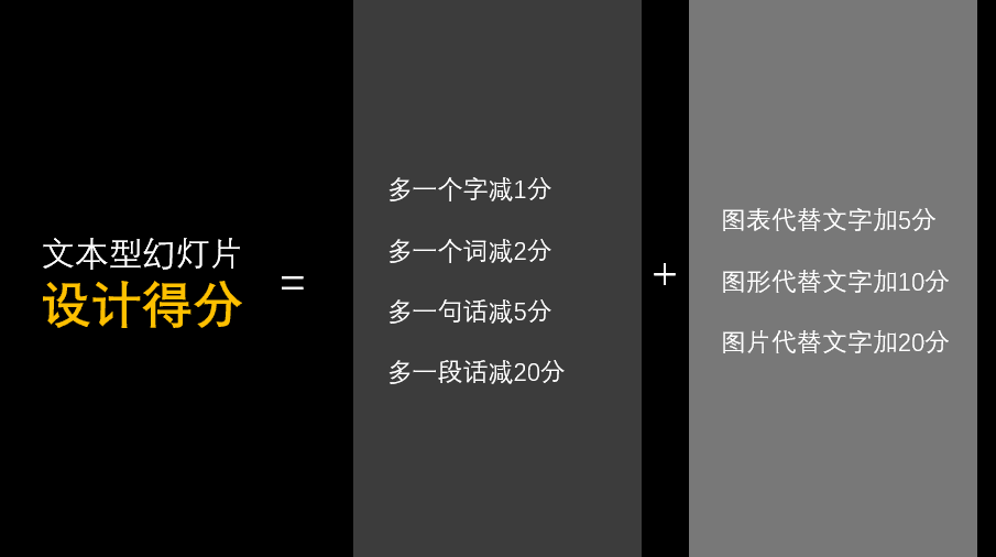 你可以参考下面的公式计算一下自己的文本幻灯片得分情况:
