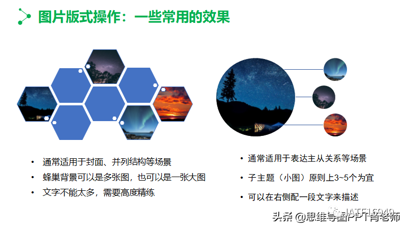 1、蜂巢效果,通常适用于封面、并列结构等场景,蜂巢背景可以是多张图,也可以是一张大图。注意,文字不能太多,需要高度精练。